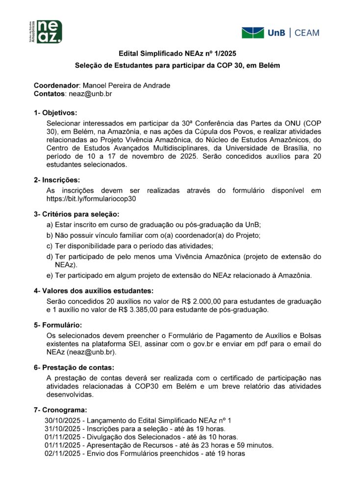 O Núcleo de Estudos Amazônicos fez uma seleção para a participação de estudantes de graduação e pós-graduação na COP 30. Para participar os/as estudantes deveriam estar inscritos/as em curso de graduação ou pós-graduação da UnB; não possuir vínculo familiar com o/a coordenador/a do Projeto; ter disponibilidade para o período das atividades; ter participado de pelo menos uma Vivência Amazônica (projeto de extensão do NEAz); ter participado em algum projeto de extensão do NEAz relacionado à Amazônia.